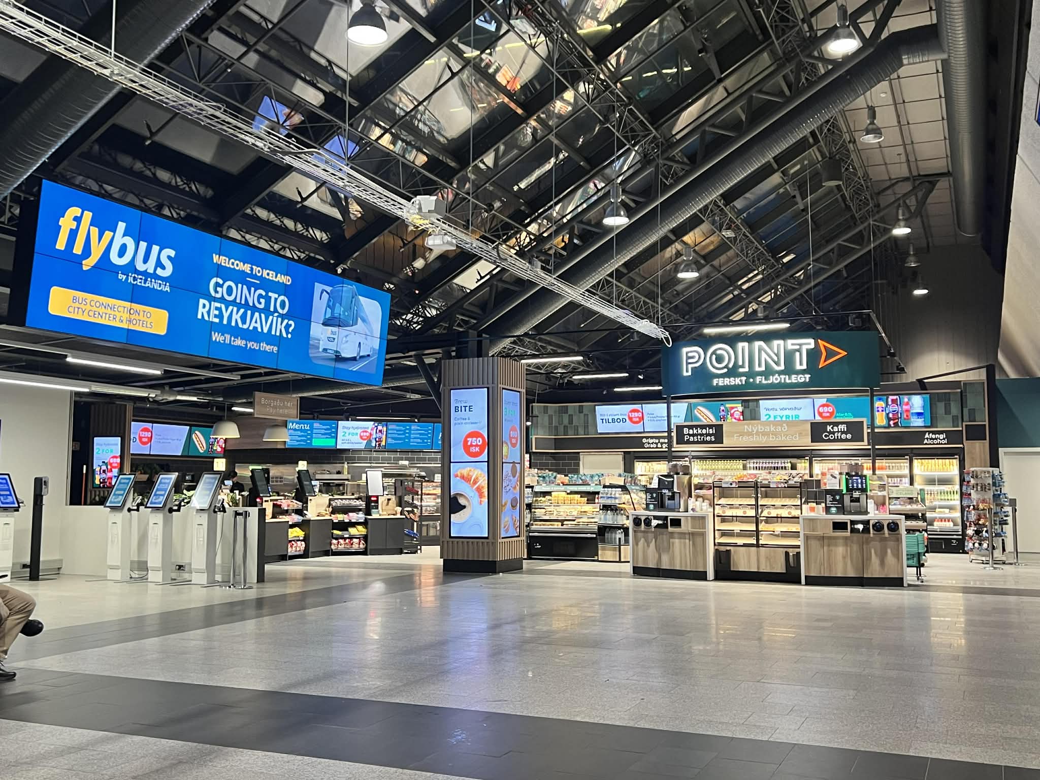 At Point located in the Airport Arrivals hall you can pickup all first day travel necessaries or just get a warm coffee. Open 24/7. If your flight ticket says (KEF) Reykjavik this is the place.